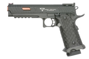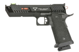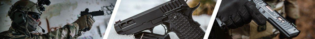 The brand's specialty is the Hi-Capa and 1911 family, including officially licensed TTI models such as the Pit Viper and Sand Viper featured in John Wick films. These full-metal replicas offer 28-round double-stack magazines with convenient base plates, enlarged magazine releases for quick reloading, flared magwells, and ambidextrous thumb safeties. Each pistol features adjustable hop-up systems, optics-ready mounting plates for red dot sights, integrated accessory rails, and aggressive grip texturing for secure handling in any conditions. Models include 5-inch barrels with compensators and 11x1 CCW threading for suppressor compatibility.