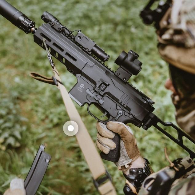 The sling keeps the replica compact against the body with the barrel pointed down, ensuring full shooting readiness without restricting movement. The polymer buckle enables lightning-fast weapon release, even when wearing a plate carrier or helmet. Transitioning the rifle to back or side carry poses no problem. The sling adapts to right or left shoulder, making it a universal choice for right- and left-handed shooters.